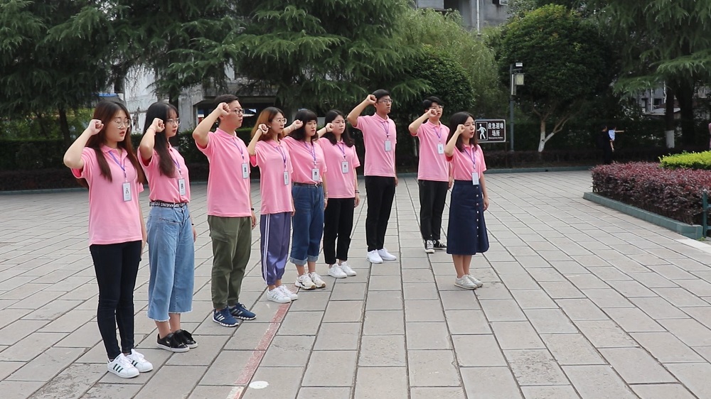 (团队在贺龙雕像前朗读入党誓词)