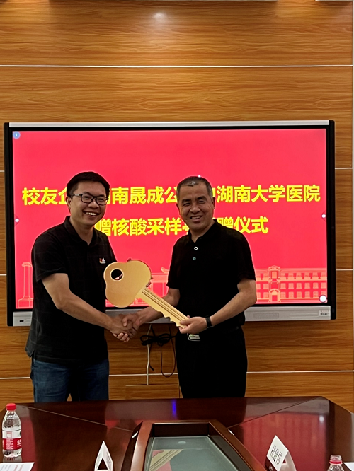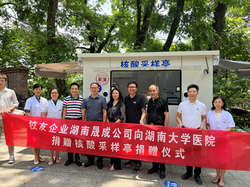 首先,我校2001级工业设计专业校友、湖南晟成公司董事长唐少华先生发表了热情洋溢的致辞,表达了自己对母校深厚的感情,对白衣天使无比地敬佩,并讲述了自己的创业经历,介绍了企业的经营状况和本次捐赠的核酸采样亭的功能和特点。