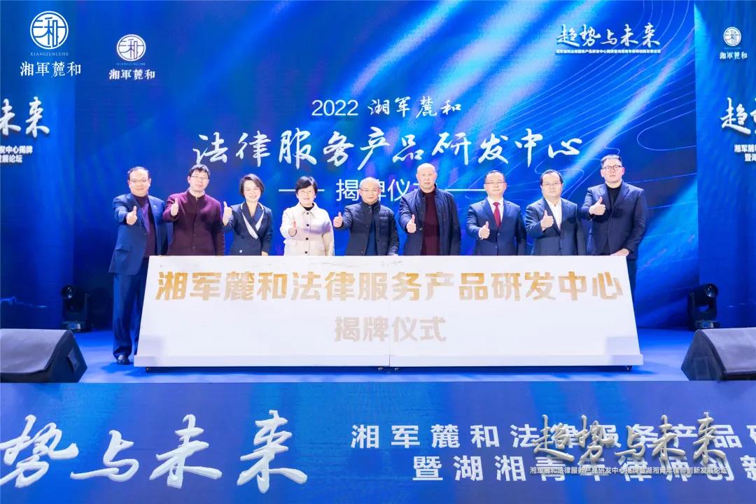 副院长、副教授蒋海松,法蝉联合创始人赵晓阳,湘军麓和律师事务所主任李含英,董事会主席杨跃共同为湘军麓和法律服务产品研发中心揭牌。
