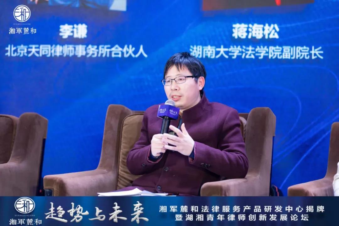 副院长蒋海松副教授作为特邀嘉宾与律师代表们进行了讨论,大家围绕“专业化是否等于产品化”、“如何抉择团队协作和单打独斗”两大问题展开了深入的讨论,现场气氛十分热烈。蒋海松老师对法律服务发展趋势的精辟论述受到听众热烈欢迎。