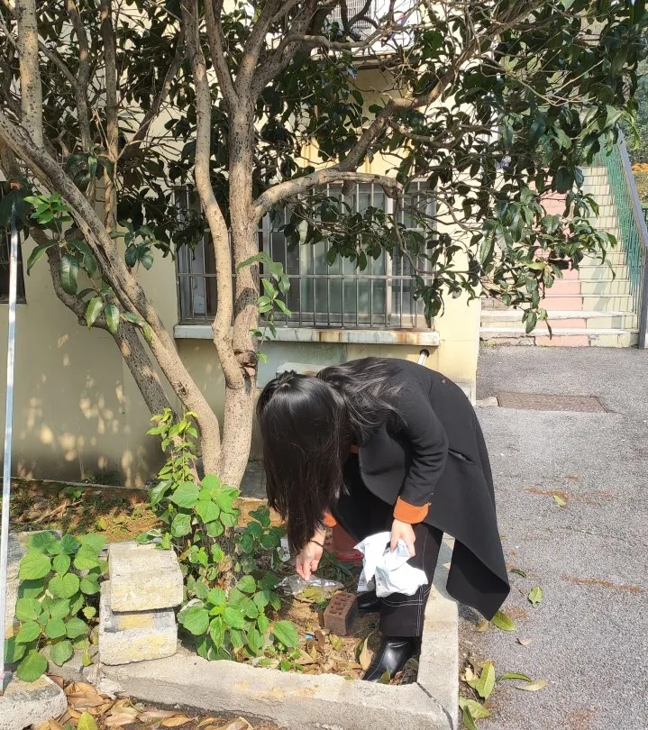 同志们分工协作,有的手持扫帚清扫落叶,有的徒手仔细捡拾起散落在各处的废弃物,还有的认真清除园地上的落花杂草,充分发扬不怕脏、不怕累的服务精神。