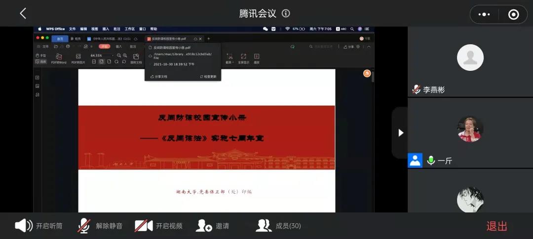 本次团日活动采取线上视频与线下会议相结合的方式,由各班团支书主持。通过集中展示反间防谍校园宣传小册的形式向班级同学普及国家安全、密码安全,反恐怖、反间谍、反窃密、反邪教及扫黑除恶、平安建设等有关知识和防范应对措施。