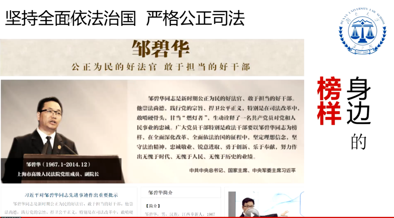严雨琪同学为大家介绍了邹碧华法官的事迹。邹碧华崇法尚德,践行党能宗旨、捍卫公平正义,生动诠释了一名共产党员对党和人民事业的忠诚。习总书记也对广大党员发出号召,“要以邹碧华同志为榜样,在全面深化改革、全面依法治国的征程中,坚定理想信念,坚守法治精神,忠诚敬业、锐意进取、勇于创新、乐于奉献,努力作出无愧于时代、无愧于人民、无愧于历史的业绩。”