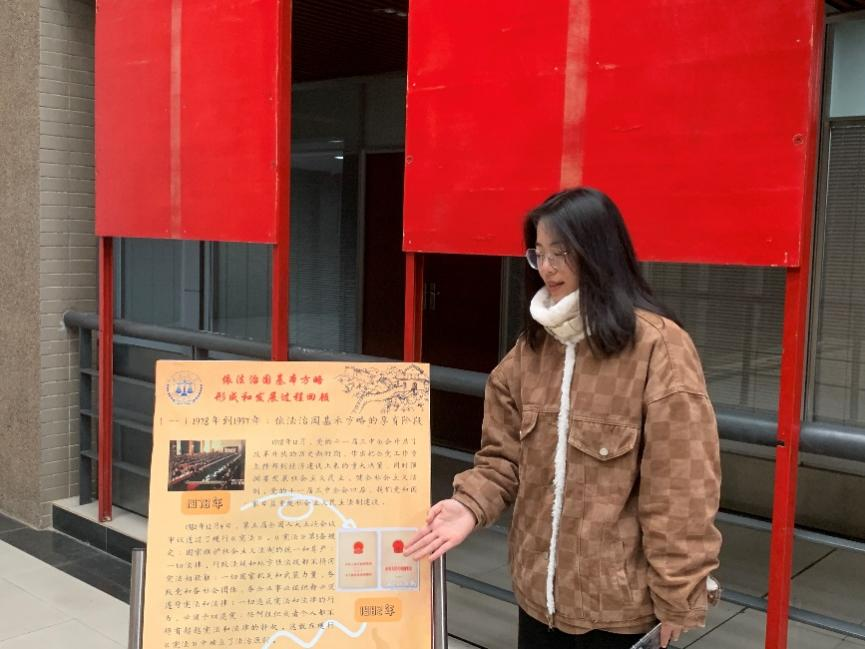 首先,宣讲员刘静雯介绍了1978年到1997年我国依法治国基本方略的孕育阶段,从1978年党的十一届三中全会开启改革开放到1982年《宪法》的通过,虽然在这一阶段依法治国基本方略尚未提出,但“十六字方针”的提出和宪法及一系列重要法律的修订出台,清晰阐释了依法治国的基本精神,为依法治国方略的形成奠定了思想基础和制度基础。