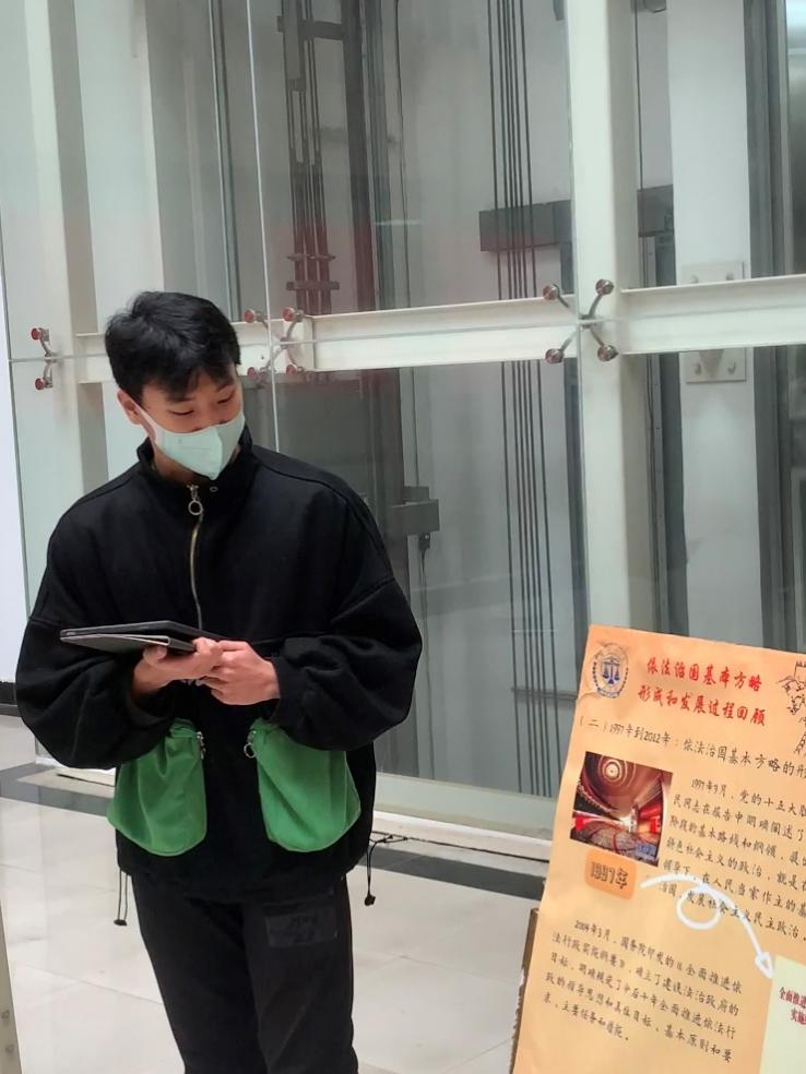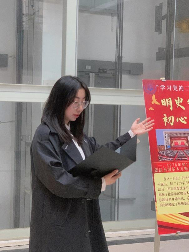 最后,宣讲员吴梦琪结合习近平总书记在二十大报告中的发言进行总结,我国依法治国基本方略提出、发展和完善的历史经验表明,党的坚强领导是中国特色社会主义最本质的特征,是坚定不移走中国特色社会主义法治道路、不断推进社会主义法治建设最根本的保证。把党的领导贯彻到依法治国的全过程和各方面,是我国社会主义法治建设的一条基本经验。世事虽无尽,人心终有归。建设一个富强、民主、文明、和谐的社会主义现代化国家,是近代以来中国人孜孜追求的梦想,而社会主义法治是实现这一追求的重要保障。