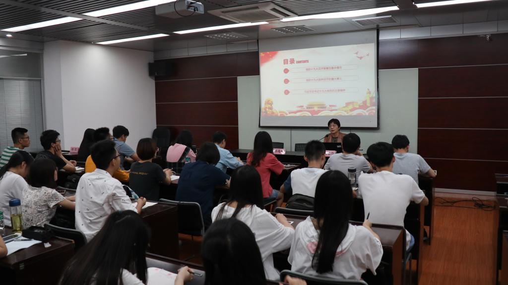 在为同学们讲述了十九大胜利召开的重大意义时,付书记谈道“我们党十九大的胜利召开在政治上、思想上、理论上、实践上乃至世界历史上都有极其重大的意义和地位,获得了国内外各大主流媒体以及外国政要的肯定。” 付书记还在整个党课过程中多次引用习近平总书记名言,让同学们对十九大报告有了一个更深层次的认识,获得了思想境界的提高。她希望同学们能够多下功夫认真学习十九大精神和习近平新时代中国特色社会主义思想,将其内化于心、外化于行,为实现中华民族伟大复兴中国梦的宏伟目标做出应有的贡献。