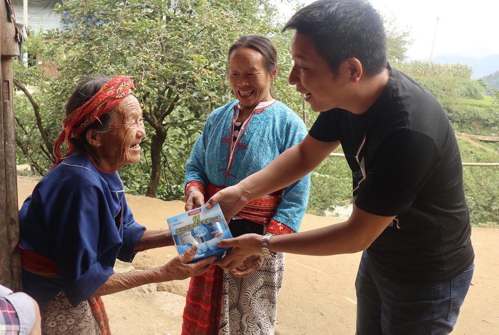 (教工行政党支部书记湛建云为老人送上补钙品)