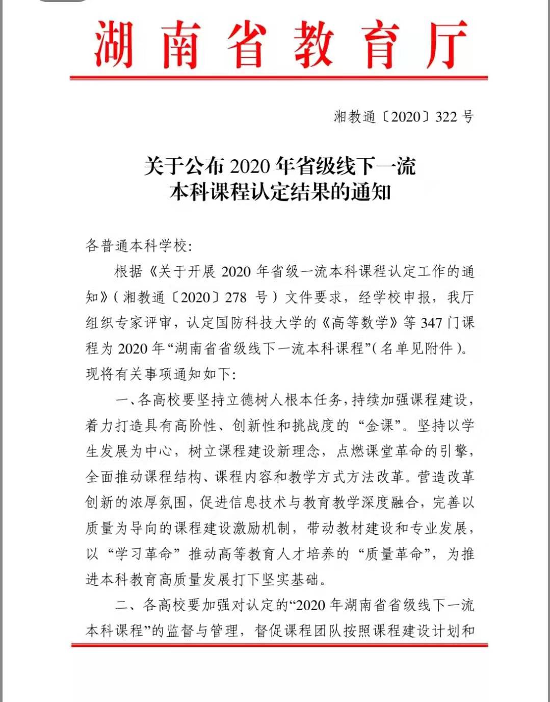 2020年12月26日,湖南省教育厅发布了《关于公布2020年省级线下一流本科课程认定结果的通知》(湘教通[2020] 322号),调教动漫