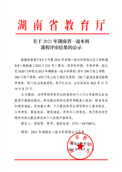 教学创新的重要成果,彰显了课程的影响力和创新性。学院将按照教育部、湖南省教育厅的要求,要坚持立德树人根本任务,持续加强课程建设,着力打造具有高阶性、创新性和挑战度的“金课”,坚持以学生发展为中心,树立课程建设新理念,营造改革创新的浓厚氛围,为推进本科教育高质量发展打下坚实基础。