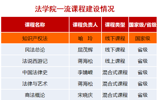 院长屈茂辉教授领衔《民法总论》入选省级线下一流本科课程。蒋海松副教授慕课《法说西游记》入选湖南省一流课程(线上类),并在今年由学校推荐参评国家一流课程。李婧嵘副教授主讲的《中国法律史》入选湖南省一流课程(线上线下混合类)。