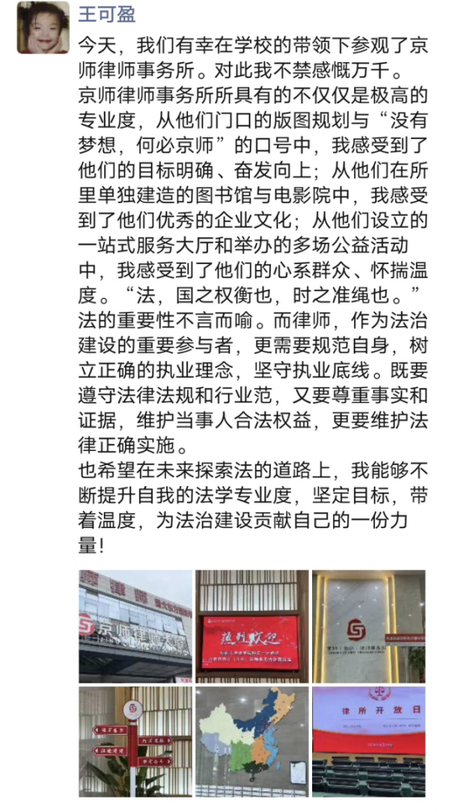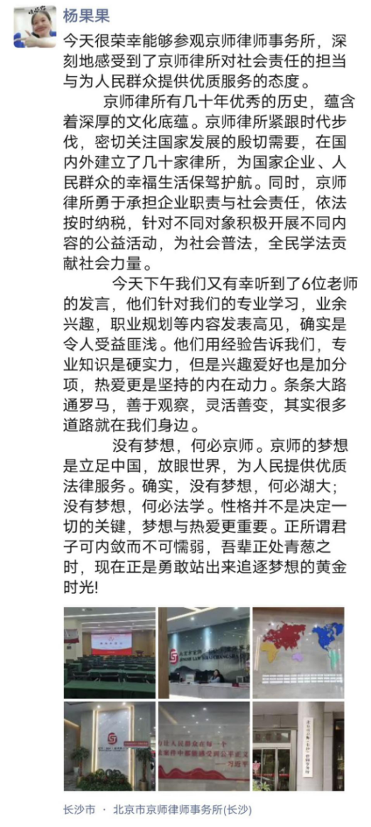 在两位律师的认真讲解之下,同学们了解到北京市京师(长沙)律师事务所(以下简称京师长沙),按照北京市京师律师事务所 2020 年第二阶段规模化发展要求,进驻长沙市设立分所。在长沙市雨花区时代阳光大道西 388 号,设立京师(长沙)律师事务所办公区域。京师长沙始终坚持总部发展理念,以“规模化、专业化、品牌化、国际化、电商化”为发展理念,实现京师长沙跨越式发展。在参观过程中,京师律所高质量和设备齐全的工作环境和同事之间和谐愉快的工作氛围打破了很多同学对律师这个职业的刻板印象,让同学们对这个职业产生了浓厚的兴趣。