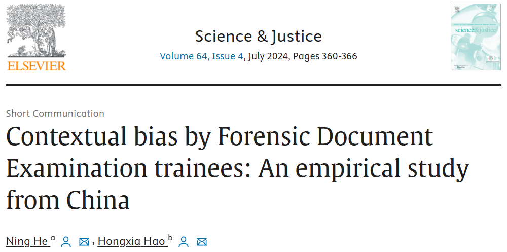 1.Contextual bias by Forensic Document Examination trainees: An empirical study from China, Science & Justice, 2024, 64(4): 360-366.