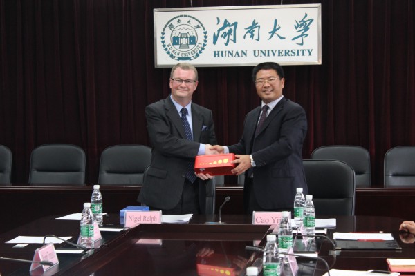 南澳大学副校长Nigel Relph与我校曹一家副校长互换礼品