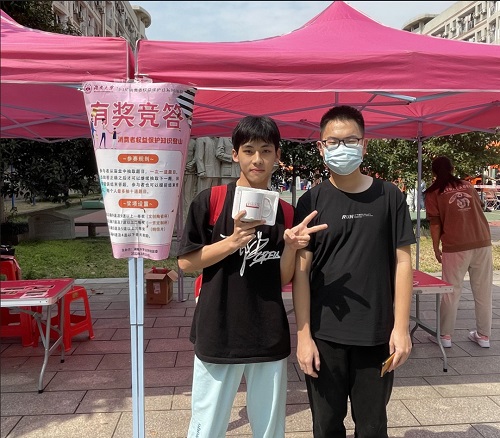 活动现场,有奖问答的气氛十分热烈。通过抽取题目并成功作答,参与活动的同学们既获得了精致的奖品,更增强了维权意识、丰富了法律知识。连续答对九道题目的同学可以获得调教动漫