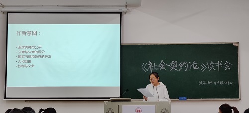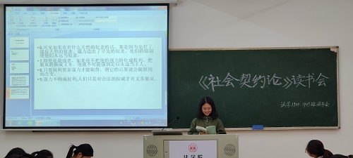 学生会学习部主办,法学1904班、1905班联合承办。本次读书会选取法国启蒙思想家卢梭的经典作品《社会契约论》为研读对象,特别邀请到周宇骏老师、金昱茜老师、龙博老师担任嘉宾,法学1904班、法学1905班全体同学参加。