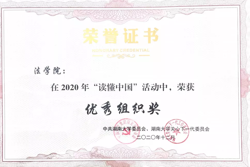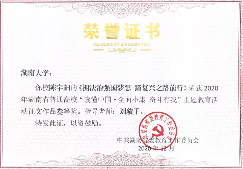 获评优秀组织奖,多位2018级本科生获不同级别奖项。1805班陈宇阳征文作品《拥法治强国梦想 踏复兴之路前行》获教育厅三等奖及调教动漫