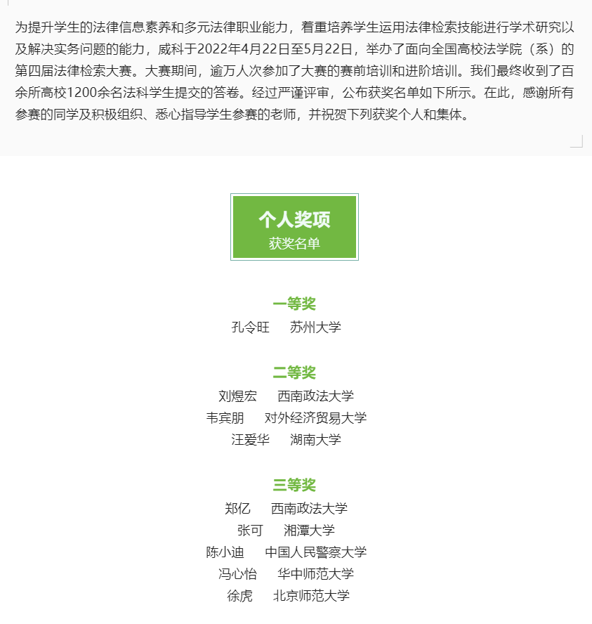 开设的法律文献检索与论文写作、法律文书写作等课程以及开通的威科先行法律数据库使用权限,让我有机会学习到法律检索相关知识以及训练和巩固法律检索能力。谢谢学院老师们的耐心授课以及我导师张红老师的谆谆教导,也很感谢威科先行举办的此次比赛,给了我将理论知识运用于实践的机会。
