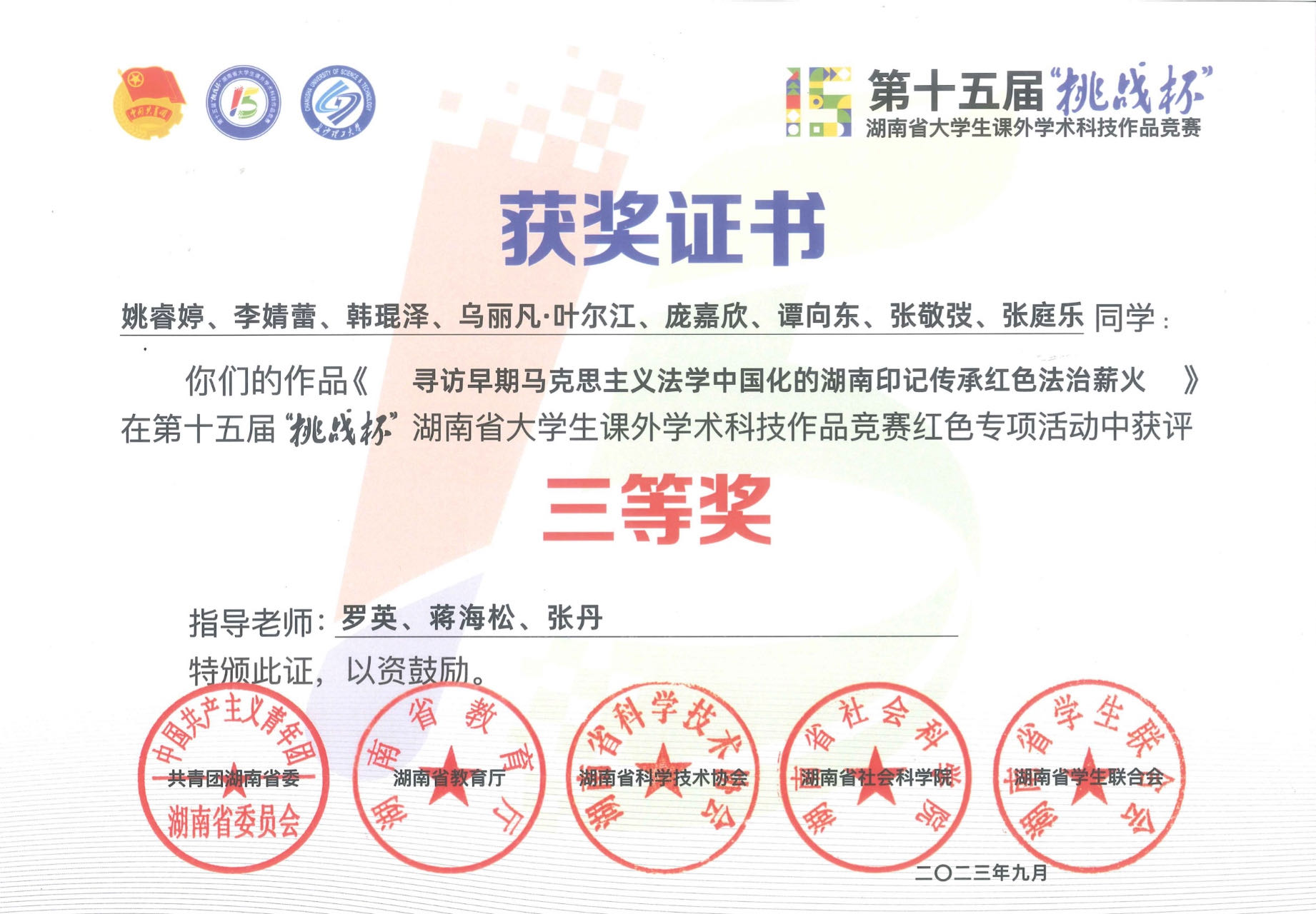 “红色法韵传习团”项目《寻访早期马克思主义法学中国化的湖南印记 传承红色法治薪火》荣获第十五届“挑战杯”湖南省大学生课外学术科技作品竞赛红色专项三等奖,之前还斩获调教动漫