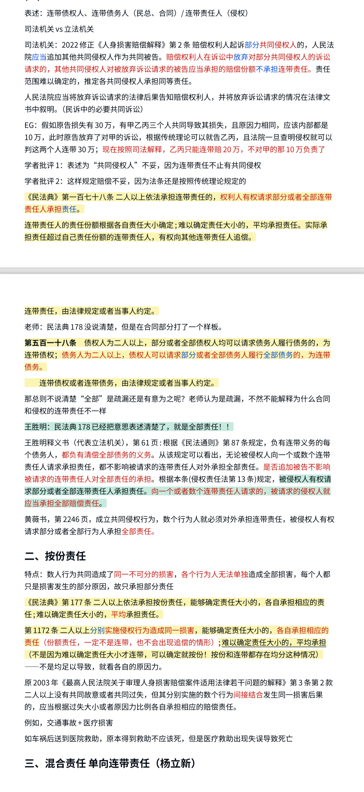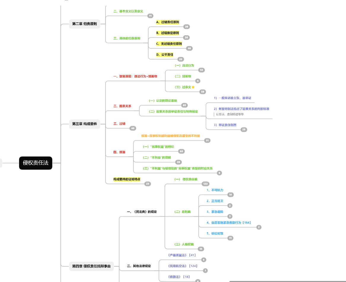 赵奕婷:首先,个人认为侵权责任法的记笔记的方式以及考试要求的核心在于明确自身所采用的知识体系,并在此基础上简明严谨地展开对问题的讨论。其次,建议整理笔记时深挖学习中遇到的细节、辩证思考每一个法条,特别是旧《侵权责任法》和《民法典》、特殊法和一般法之间的关系以及修改变动。本课中法条的重要性和优先级极高,建议通过笔记大致复述《民法典》侵权责任编的每一条法条,并理解其背后的立法意旨与制度价值。最后建议在笔记中明确区分相关的或易混淆的概念,比如致害和受害、不同群体、不同侵权归责原则、侵权行为方式、侵权责任方式、侵权责任形态(个人建议通过思维导图来进行体系化的梳理)。