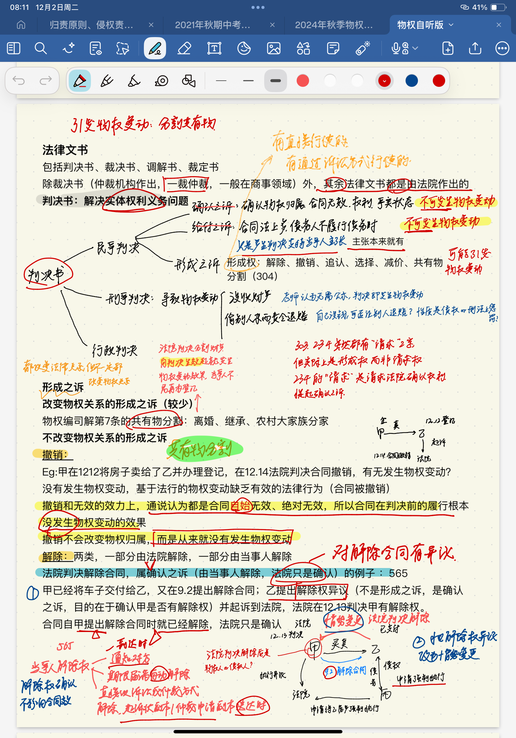 赵奕婷:个人觉得在记物权法的笔记时要精准吃透老师课堂所讲内容,做好民法总论与物权法的衔接。首先可以在笔记中体现老师上课所建构的思维模式与问题分析方式,如请求权基础规范分析方法。其次,建议使用能够同时支持手绘图功能和打字的笔记软件做笔记,因为物权法的学习中经常会有绘制人物关系图的场景,单凭打字很难快速且具象化地完成绘制。此外,个人建议以复习为导向记笔记,既便于复习时背诵,也便于让AI根据笔记出题辅助复习。最后建议在笔记中体现法条的重要性,并结合思维导图对法条进行体系化的整理以及记忆。