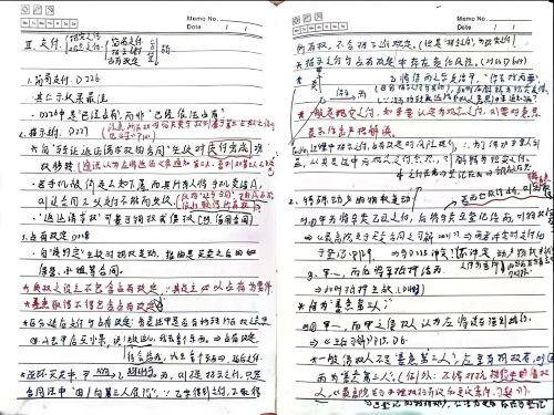 赵涵钰:因为民总课堂节奏较快、内容较多,所以老师一般会建议使用纸质版笔记。我一般会在上课时快速写下老师板书或PPT的要点框架以及老师的表达大意,先形成笔记草稿,这样既能帮助自己集中注意力、跟上讲课节奏,也能搭建本节课教学内容的框架。课后,我会根据笔记草稿和教材回忆课堂内容,消化知识点并整理出一份完整的笔记,后续再根据完整笔记总结出一个简要的框架或思维导图以方便整体的理解。这个过程虽然比较耗时,但相当于完成了一轮课后深度复习,能够补全知识漏洞,也能为期末复习打下基础。