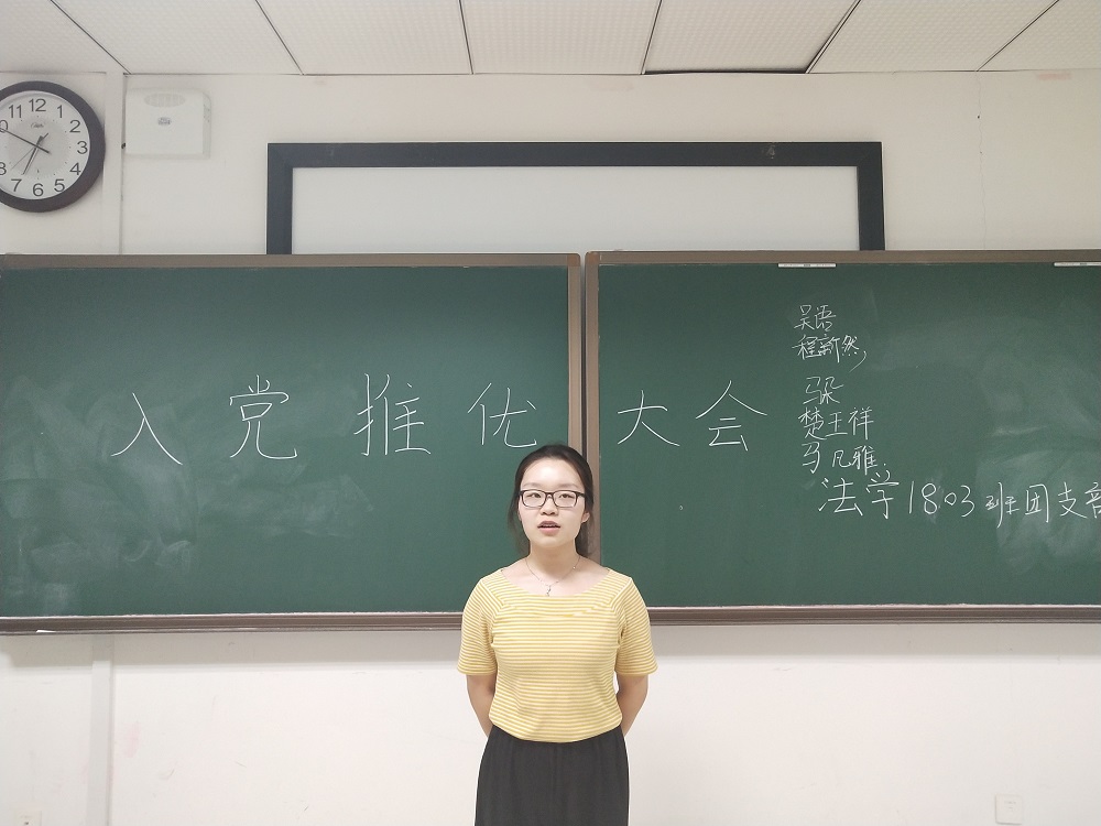 2019年是中华人民共和国成立70周年,回顾中国近代史征程,中国共产党领导中国各族人民,坚持真理,不忘初心,顽强拼搏,促成中华民族的历史性飞跃。为更好地服务于党的建设,为党的发展注入新鲜血液和力量,落实学院分团委入党推优工作,9月24日,法学1803班团支部在研究生楼A105举办入党推优大会。