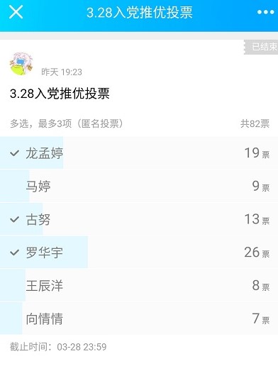 发言结束后,团支书在班级群中发起群投票,由班级其余未参与推优的同学进行推选。本次推优采取线上匿名投票方式,严格遵循公开、公平、公正、透明的原则。经过最终的票数统计,选出罗华宇、龙孟婷、古努·托乎提三位同学成为入党积极分子。至此,本次线上入党推优大会圆满结束。
