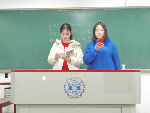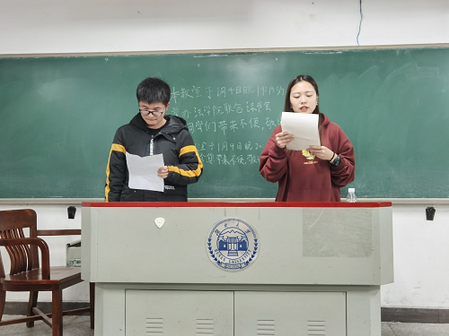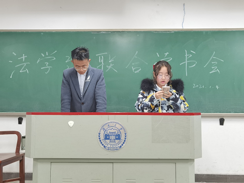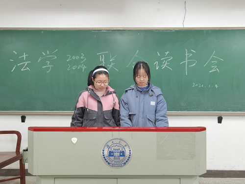 法学2003班、法学2004班全体同学于2021年1月4日晚在南校区综合教学楼举行了第一次联合读书会。法学2003班学习委员李子韩、法学2004班学习委员杨仁共同担任主持人。毛靖雯和卢检花、陈慧婷和蒋婕、俞嘉莉和邹倩懿、张丽媛和刘潇潇、刘宇芩和杨仁总共十名同学组成了五个分享小组。