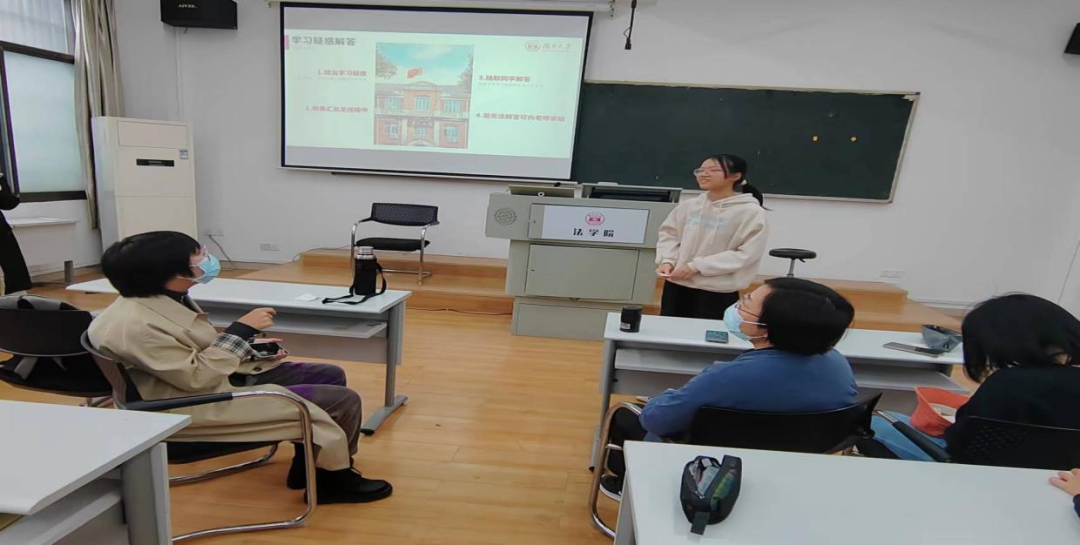 怀揣坚定信念,落实日常细节。进入班会第二个环节,大家一起回忆了近半学期以来的生活碎片,观看了《与法学相爱相杀的一天》的视频,分享自己学习法学的感受心得。观看视频后,大家对前半学期的学习中暴露出的问题有所了解,并通过写心愿纸条的方式积极提出自己的疑问,陈老师和蒋婕从不同的角度给出了细致的解答。