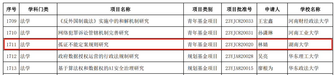 助理教授林婧所申报的法学研究青年项目《孤证不能定案规则研究》获得立项,项目批准号为23YJC820020。
