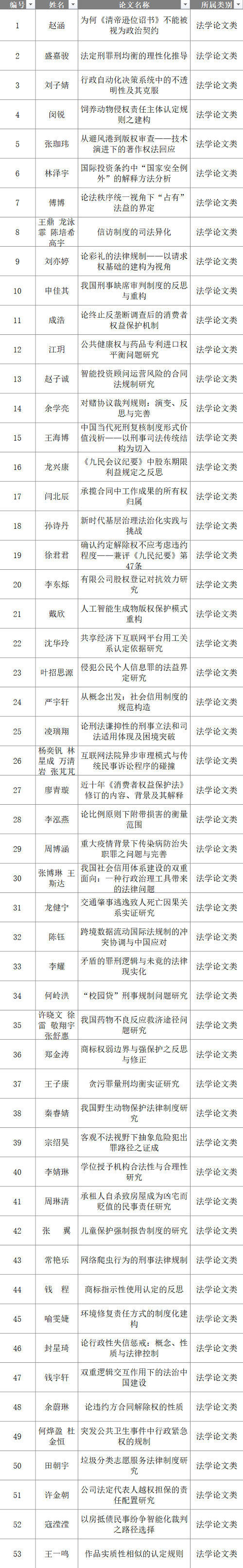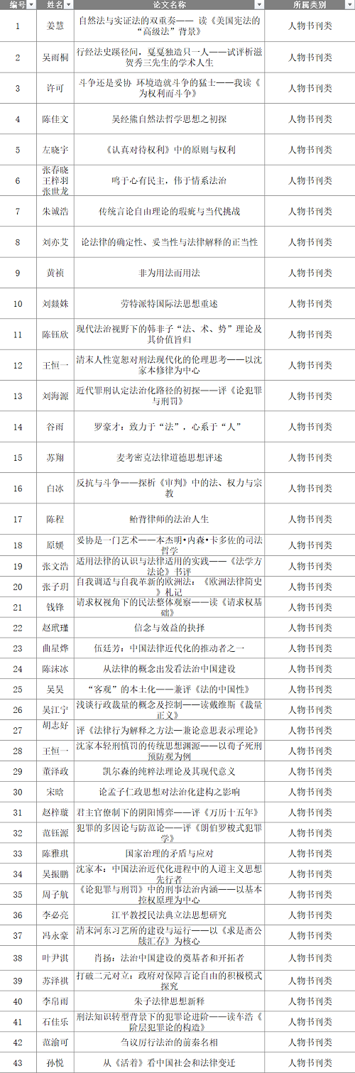 根据评审规则,每份作品由3位专家在回避的前提下进行匿名评审。受投稿数量的限制,法学论文类进入复赛需获得3个专家的“通过”票,案例分析类、人物书刊类需获得2个专家的“通过”票。最终通过专家评审的作品数量为:法学论文57份,案例分析52份,人物书刊45份。