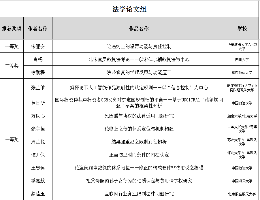 经过初赛匿名评审、参赛资格复审、复赛专家评分、专家组讨论拟定获奖建议名单和大赛组委会审定,本届大赛最终确定一等奖2名、二等奖6名,三等奖13名、优秀奖10名、优秀指导奖2名,优秀组织奖2名。因参赛作品数量和质量所限,部分奖项空缺。拟获奖名单公布如下: