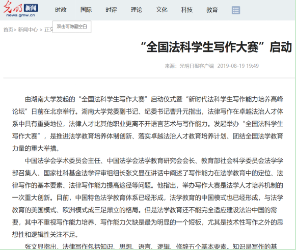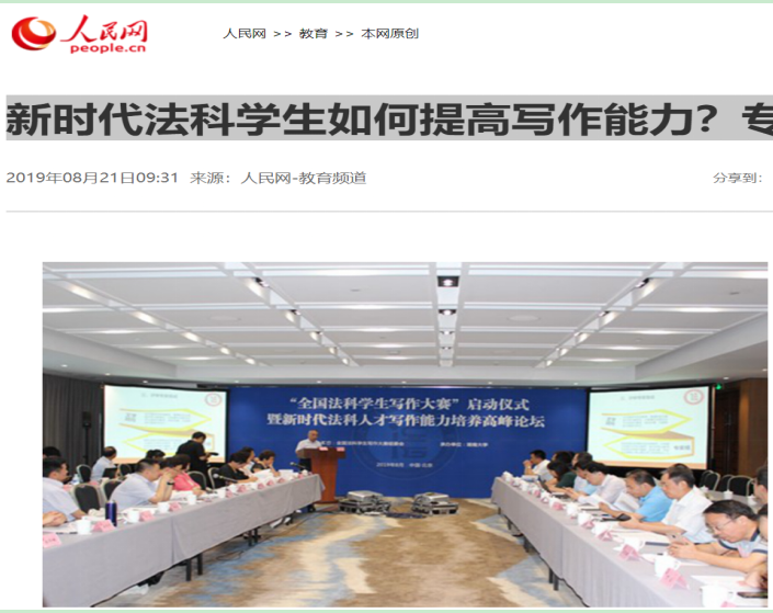 发起的“全国法科学生写作大赛”启动仪式暨“新时代法科学生写作能力培养高峰论坛”在北京友谊宾馆隆重举行,写作大赛的成功启动引发全国媒体密集报道。