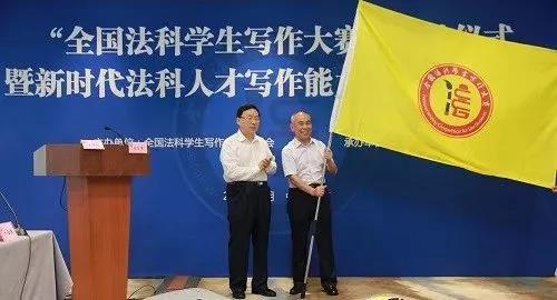 发起的“全国法科学生写作大赛”启动仪式暨“新时代法科学生写作能力培养高峰论坛”在北京友谊宾馆隆重举行,组委会名誉主任张文显教授向组委会秘书长屈茂辉教授授旗)