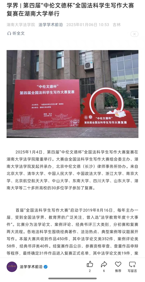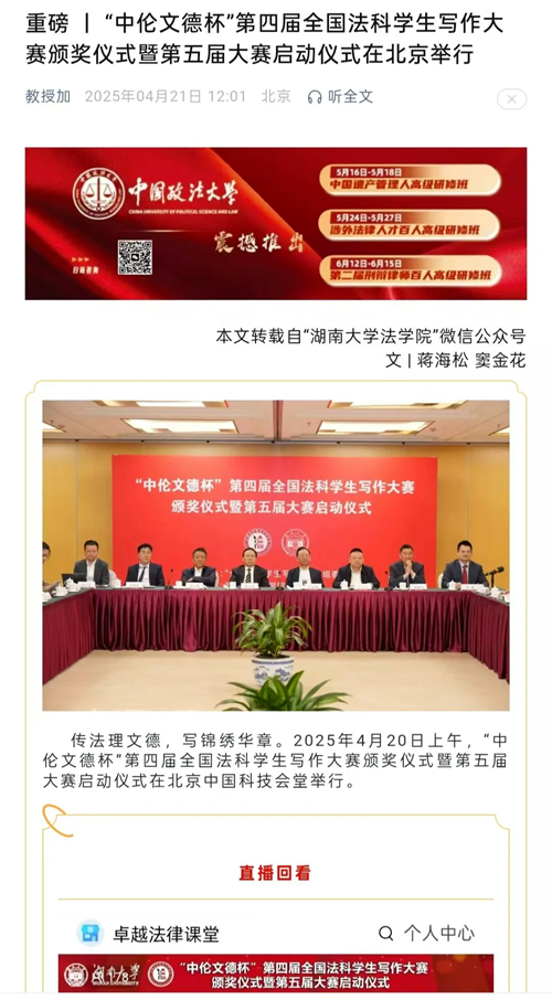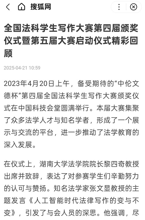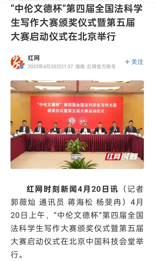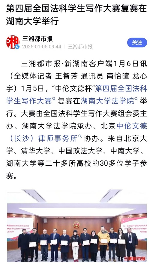 “中伦文德杯”第四届全国法科学生写作大赛颁奖仪式暨第五届大赛启动仪式的成功举办引发全国媒体密集报道。据不完全统计,已有《法治周末》《湖南日报·新湖南》《三湘都市报》及红网、金台咨讯、搜狐网、人民网—湖南频道、科学网、法学学术前沿、教授加、湘江法学等全国多家媒体或机构推出相关报道。特此辑录相关媒体并致谢。 相关媒体报道截图: