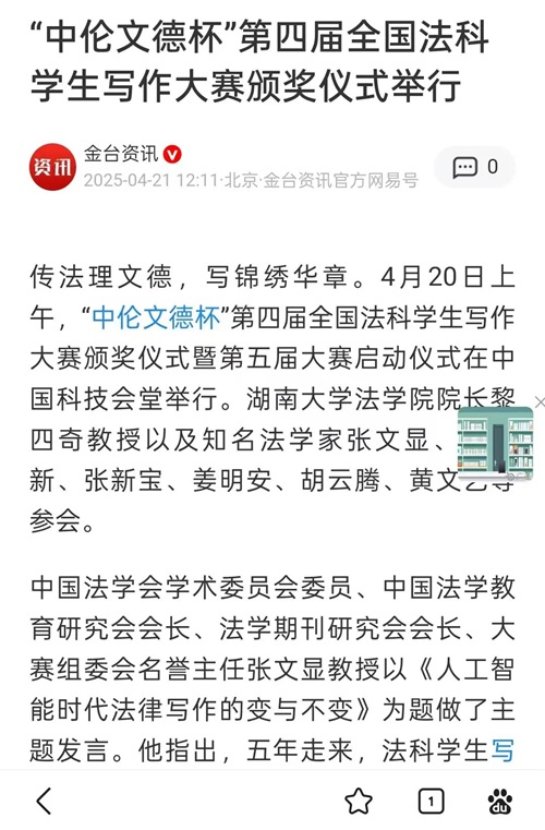 传法理文德,写锦绣华章。2025年4月20日上午,“中伦文德杯”第四届全国法科学生写作大赛颁奖仪式暨第五届大赛启动仪式在北京中国科技会堂举行。 “全国法科学生写作大赛”由大赛组委会主办、调教动漫