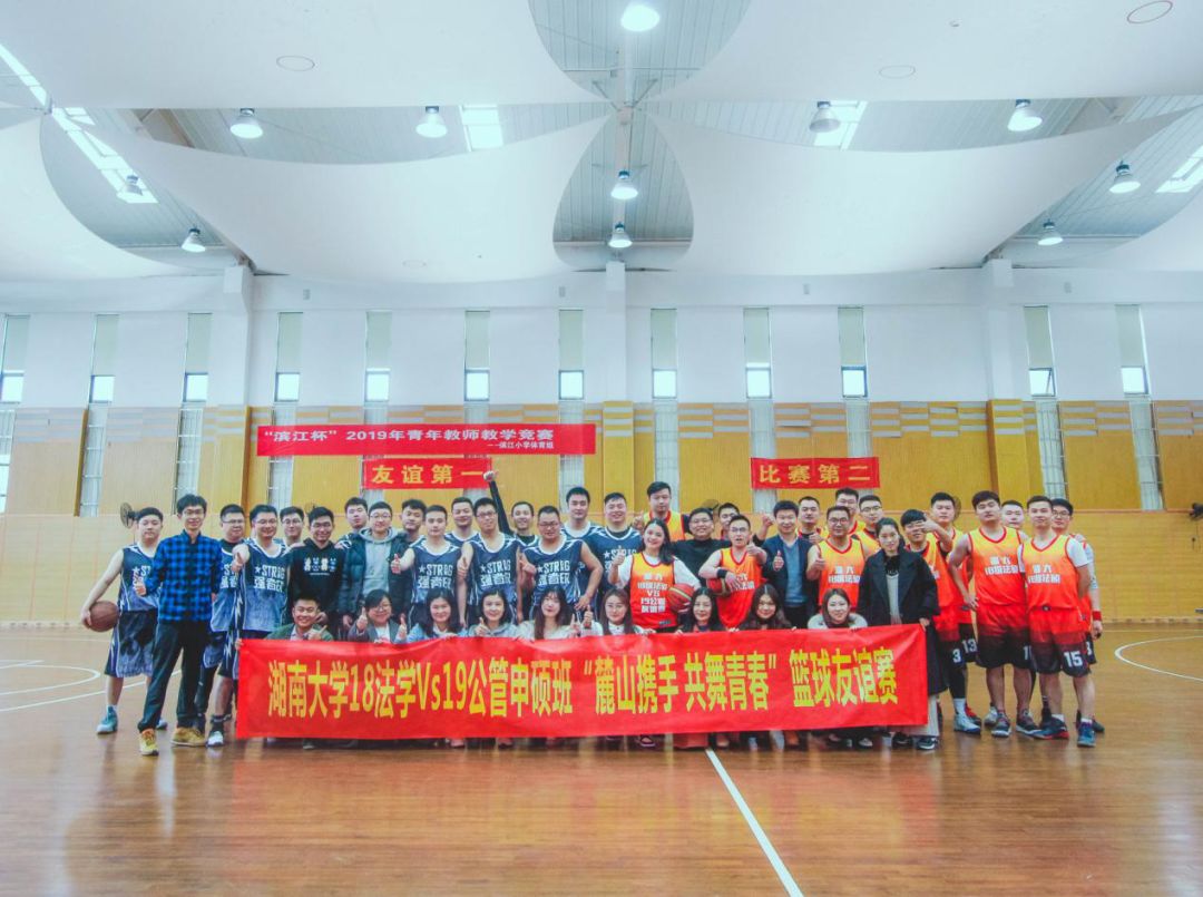 2019级公共管理申硕班与2018级法学申硕班“麓山携手 共舞青春”篮球友谊赛在长沙市岳麓区滨江小学篮球馆火热开打。这是两个班级的第一次联谊活动,学院张娜老师与双方女同学也化身各方啦啦队在赛场边强力助威。
