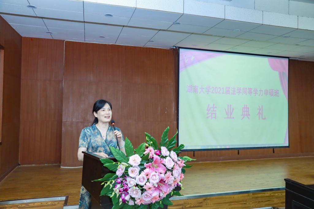 湛建云副院长随后致辞。他对在场每一届学生人数如数家珍,并给了所有结业同学一个大大的赞。他说道今年非常流行的一句话叫做“反内卷,去躺平”,大家有时确实会觉得生活艰辛,但是不妨把心态摆正,尽量减少焦虑。另外,他希望大家永远不要失去奋斗的目标,不管是否从事法律职业,永远保持有所追求。人生就似一列飞奔的列车,湖大求学只是其中的一个站点,结业也只是一个阶段。旅途还在继续,我们没有理由去放下心目中的梦想。最后,他祝愿大家有一个强健的身体,只有身体康健,一切才有意义,一切才皆有可能。