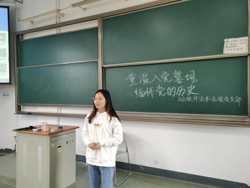 2020级法律硕士(非法学)党支部开展“学史明理”主题党日活动,全体党员以重温入党誓词的形式,缅怀党的历史,深入学习贯彻以习近平为核心的党中央关于在全党开展党史学习教育的重要精神。