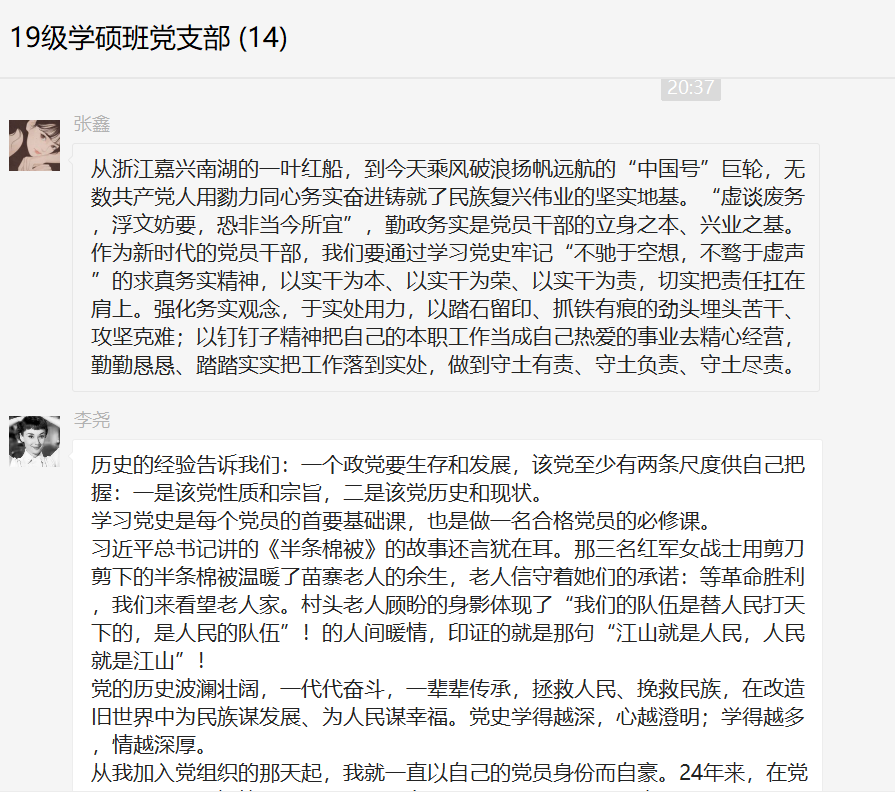党的光辉历史和伟大业绩激励着我们继往开来,我们应当汲取党史中的智慧,牢记党的理想信念,不忘初心,以史为鉴,明确自己的奋斗目标,坚定永远跟党走的决心,走好新时代的长征路!而石雪莉同志也通过自己对十九届五中全会的内容及重要意义的学习提出自己的理解看法:通过对党史的学习,我深刻认识到学习党史就是要我们始终牢记党的理想信念,不忘初心,以史为鉴。我们只有了解党的发展历程,汲取党史中的智慧,才能明确自己的奋斗目标,坚定永远跟党走的决心,走好新时代的长征路。开展党史教育不仅是一次砥砺初心使命的历史教育,是一次坚定理想信念的政治教育,也是一次把握职责任务的时势教育。习近平总书记指出我们党的一百年,是矢志践行初心使命的一百年,是筚路蓝缕奠基立业的一百年,是创造辉煌开辟未来的一百年。在全党开展党史学习教育,是牢记初心使命、推进中华民族伟大复兴历史伟业的必然要求,是坚定信仰信念、在新时代坚持和发展中国特色社会主义的必然要求,是推进党的自我革命、永葆党的生机活力的必然要求。新的号角已经吹响,新的伟大征程已经开启。党的100华诞的今年,共产党及全国人民会更加紧密地团结起来,再接再厉、同心协力、不断进取,扎扎实实做好改革发展稳定各项工作,进而夺取全面建设小康社会新胜利,以更加优异的成绩来庆祝党的100岁生日,100载艰苦卓绝,100载荣耀辉煌。没有共产党就没有此刻的新中国,我坚信:中国共产党是时代的中流砥柱,是中华民族的脊梁。我相信,在党的带领下,我们的祖国将一天比一天强大,一天比一天繁荣。