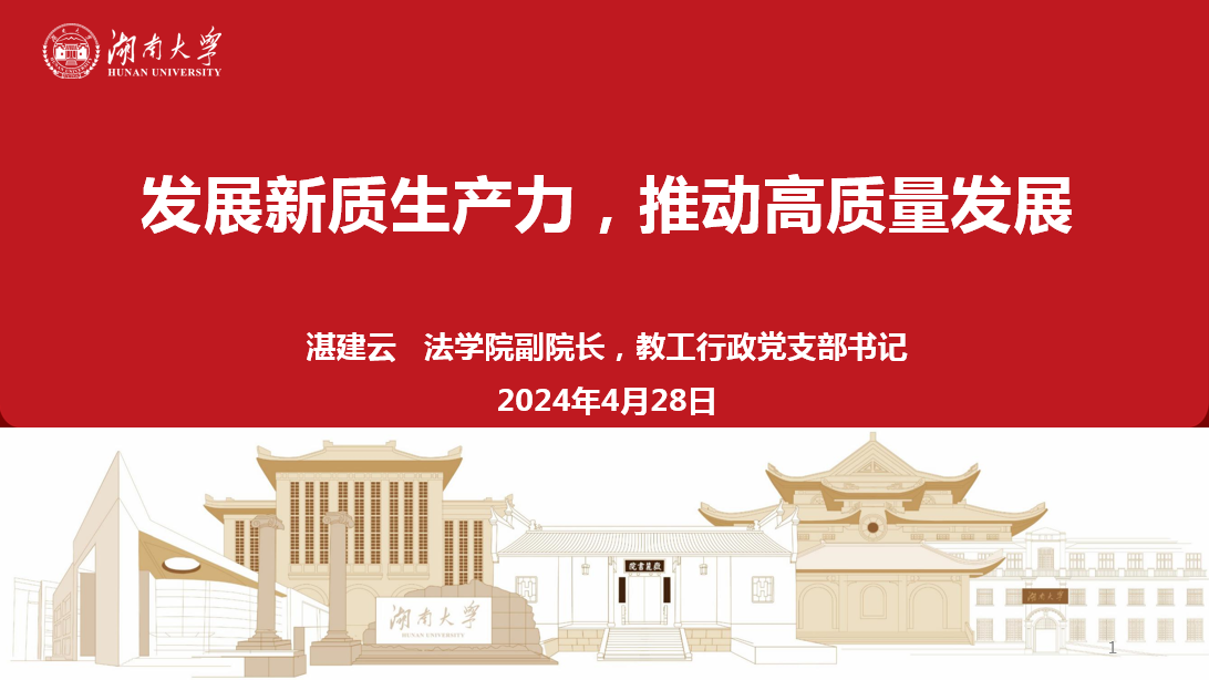 通过介绍新质生产力提出的背景,对比传统生产力,湛建云详细阐述了新质生产力的科学内涵,分析了新质生产力与高质量发展之间的关系。他强调,新质生产力的特点是创新,关键在质优,本质是先进生产力。他以长沙建设“全球研发中心城市”为例,介绍了长沙在发展新质生产力方面的新作为、新担当。他指出,新质生产力是推动高质量发展的内在要求和重要着力点,也给学院今后的建设和发展带来了新机遇、提出了新要求。