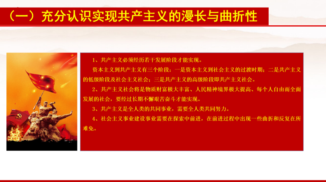 随后,马老师从认识与行动两方面展开,详细地讲解了怎样实现共产主义。马老师指出,充分认识实现共产主义的漫长性与曲折性是实现共产主义的首要前提,共产主义社会只有经过长期努力、艰苦奋斗才能实现。既要做共产主义的坚定信仰者,又要做共产主义的忠实践行者。马老师勉励同学们牢记党的嘱托,以立志做“有理想、敢担当、能吃苦、肯奋斗”的新时代好青年标准要求自己,坚持听党话、跟党走,让青春在全面建设社会主义现代化国家的伟大实践中绽放绚丽之花。