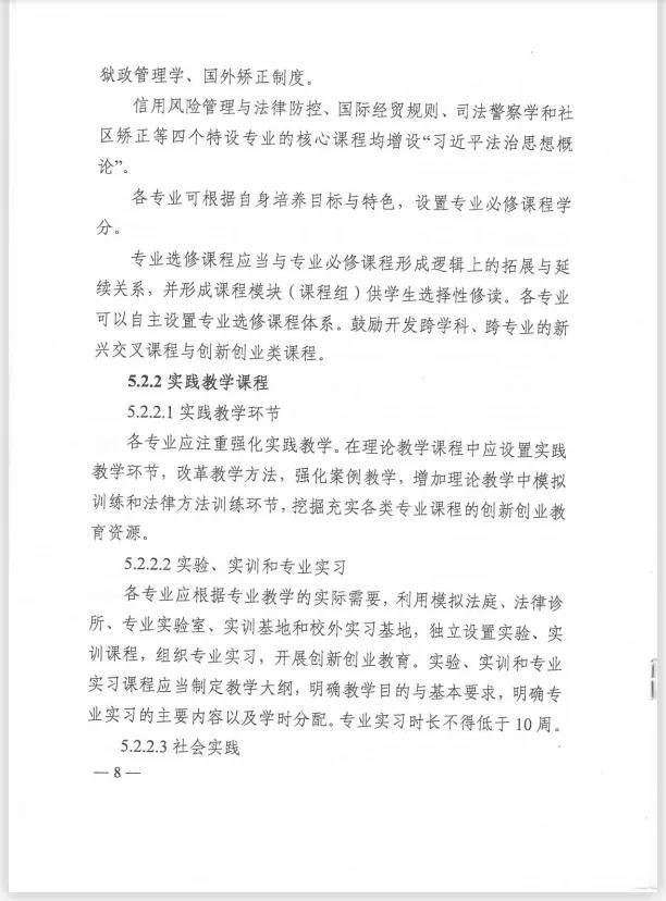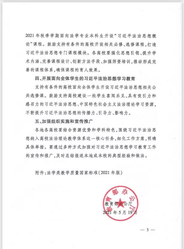 新修订的《法学类专业教学质量国家标准(2021年版)》(见附件),明确了习近平法治思想的指导地位,将“习近平法治思想概论”纳入法学专业核心必修课。各高校应参照《法学类专业教学质量国家标准(2021年版)》修订法学专业人才培养方案,于2021年秋季学期面向法学专业本科生开设“习近平法治思想概论”课程。鼓励支持有条件的高校开设相关必修、选修课程,打造习近平法治思想专门课程模块。各高校要强化思想引领、提升学术内涵、完善课程设计、创新方法手段、加强师资培训,推动形成完善的课程体系,确保课程的育人效果。