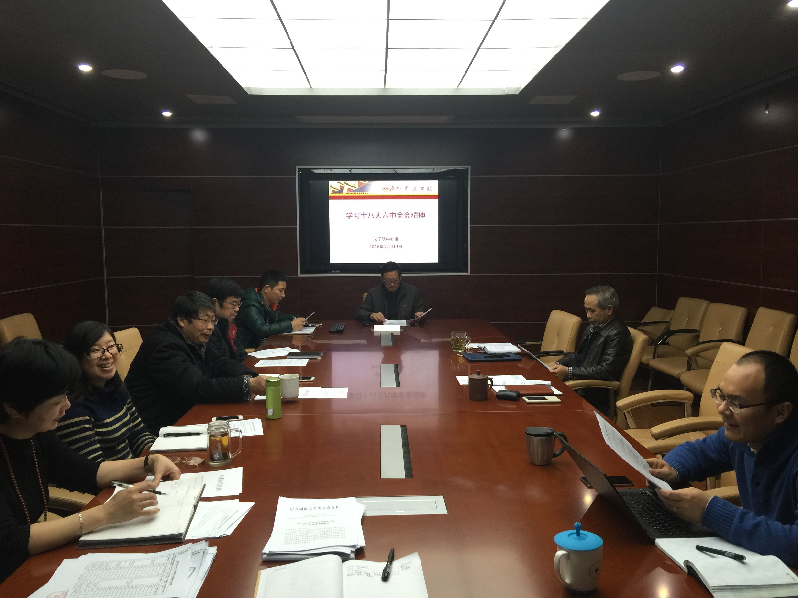 为总结2016年度学院党委工作,对党员发展、转正、党费收缴等重点工作进行集中讨论,同时组织中心成员围绕十八届六中全会会议精神组织集中学习,学院组织院党委委员、中心组成员召开院党委委员会暨中心组第八次集中学习。