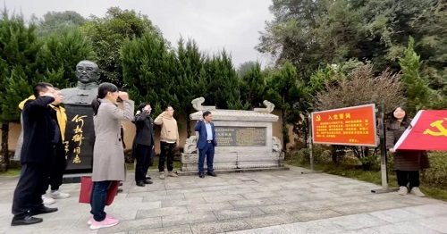 参观完谢觉哉、何叔衡两位革命先辈的故居后,在何叔衡同志故居的前坪,易骆之同志带领大家面对党旗,重温入党誓词。