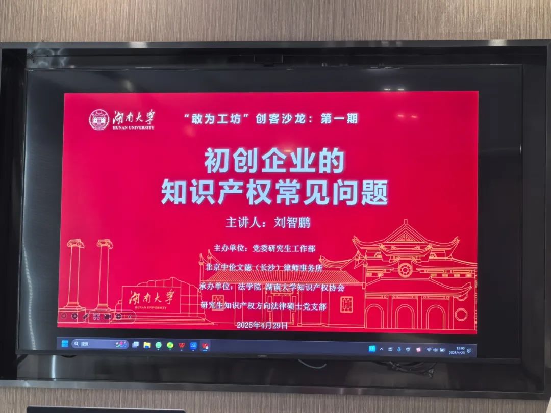 、知识产权协会及知识产权法律硕士党支部联合承办的“敢为工坊”创客沙龙首期活动在长沙后湖艺术园成功举办。活动以“初创企业的知识产权常见问题”为主题,北京中伦文德(长沙)律师事务所主任田学军主持,特邀中南财经政法大学知识产权法学博士刘智鹏担任主讲,旨在通过政策解读与实务指导,破解大学生创新创业中的知识产权难题,助力“金种子”项目成长。